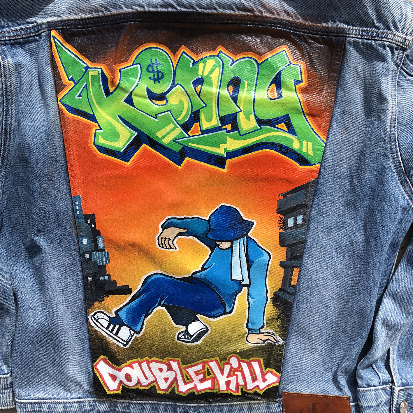 The design theme for this set is “Double Kill”, featuring a dynamic breakdance pose on the back of the jacket, paired with bold graffiti-style lettering. The jeans are hand-painted with the word “B★BOY”, laid across the pant leg in striking colors to capture the energy and essence of street culture.