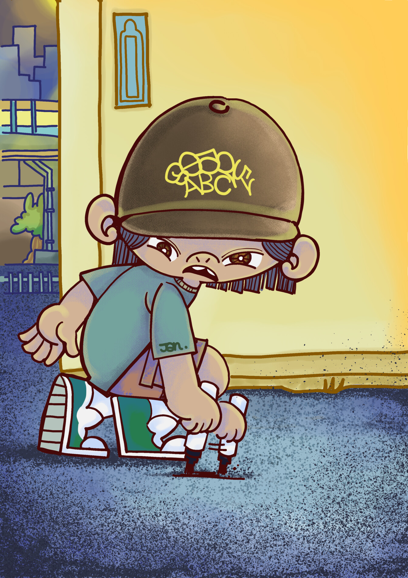 這幅插畫想捕捉的,不只是街頭塗鴉(graffiti ) 的氛圍,也想呈現「塗鴉簽名前的儀式感」。