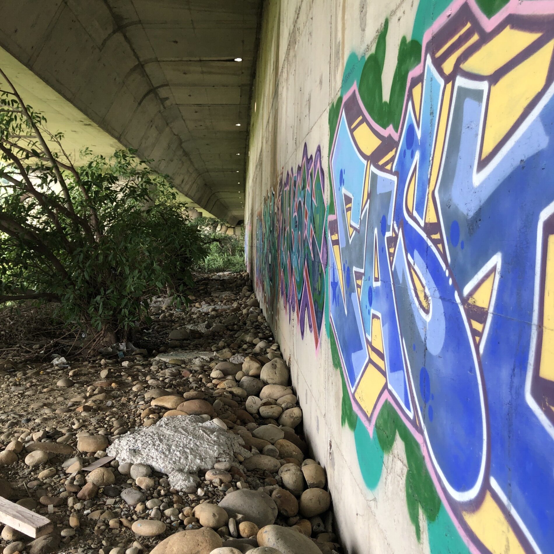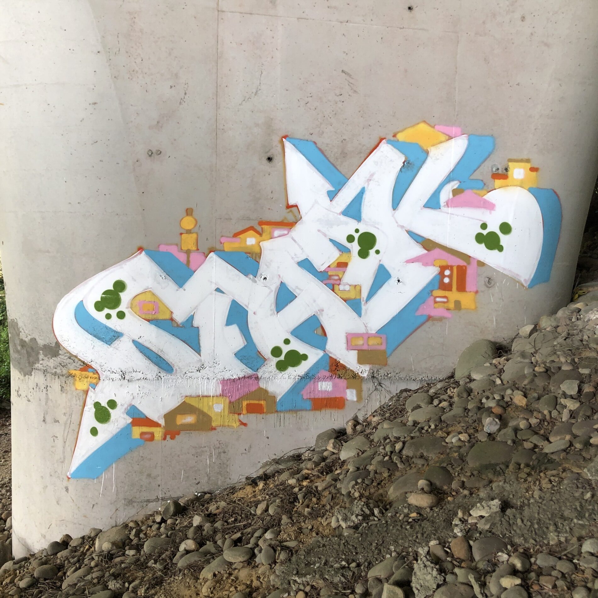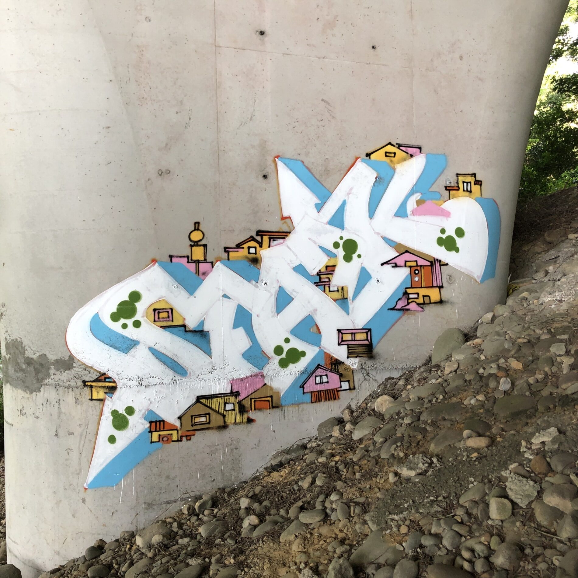 這次依舊沒有準備草圖,靠著騎車感覺引導,憑直覺找適合的點。騎著騎著,到了一個隱密又有樹蔭的舊SPOT,原本想塗的牆面不太理想,臨時改變計畫——那就畫在柱子上吧!這次挑戰 斜上走勢的字體結構,一步一步把自己的感覺畫上牆。